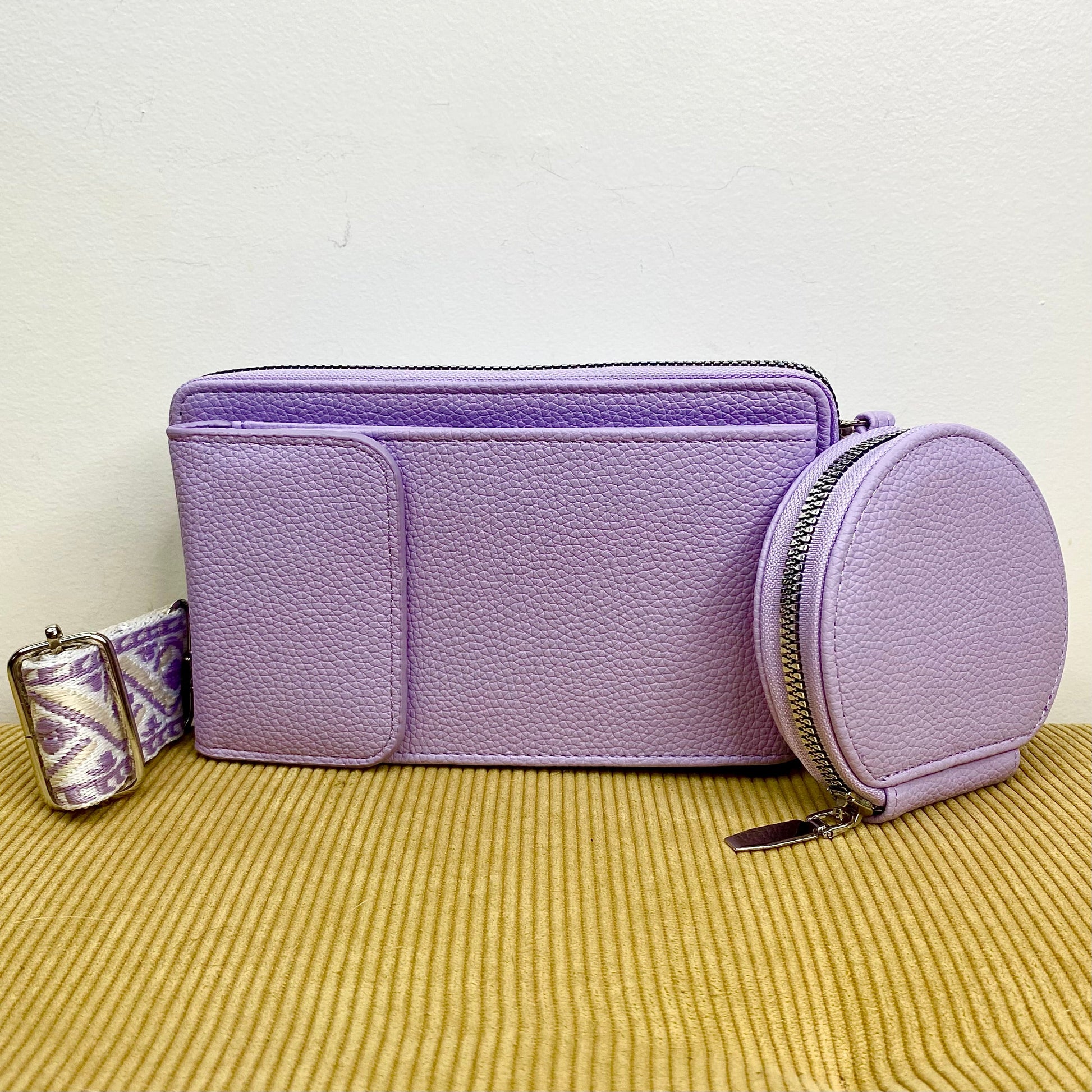These feature 2 compartments, one with a flap for a phone (larger phones, cases, or accessories may not fit, please check the measurements of your specific phone) and one zip around wallet. It comes with a removable strap!