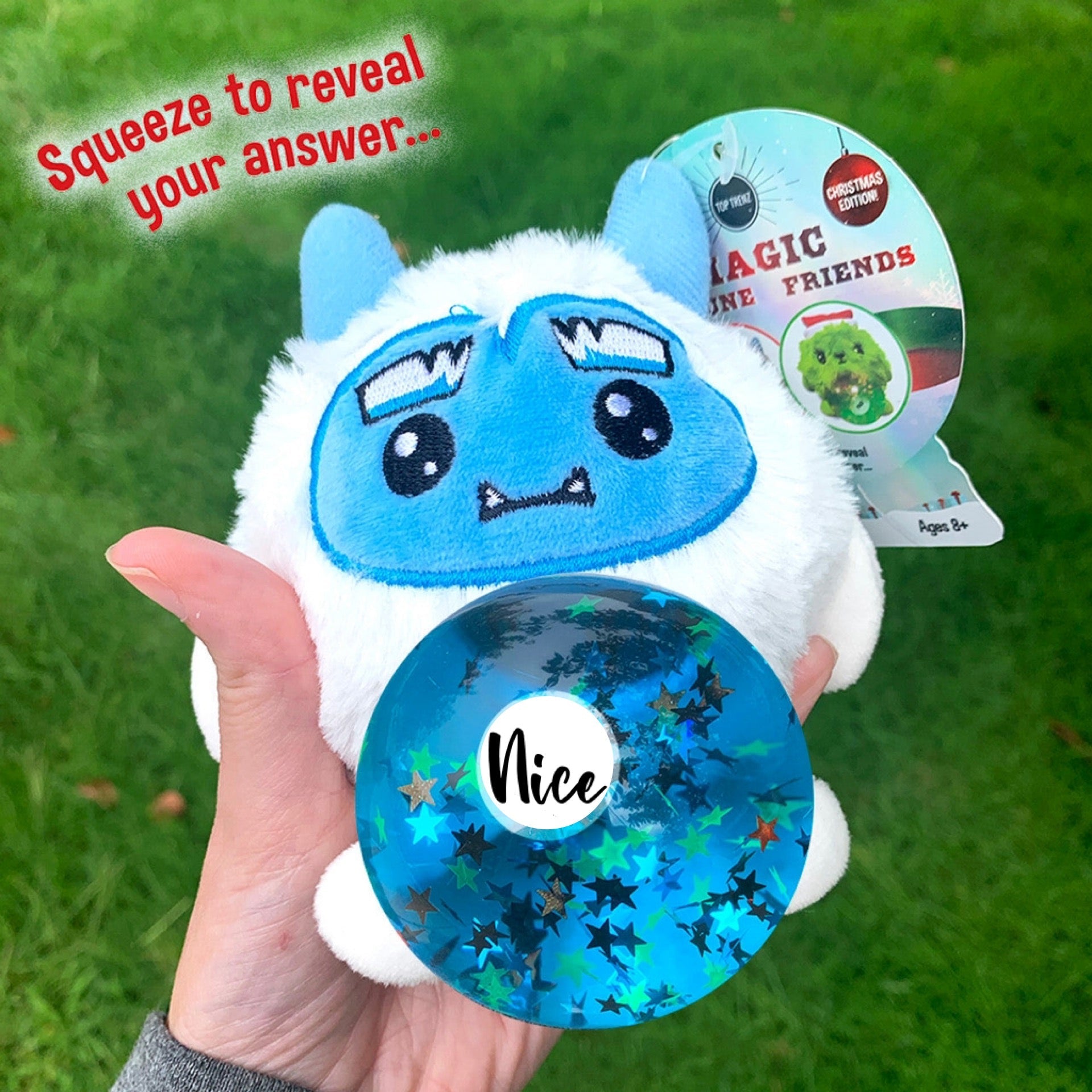 It's the fun plush squishy water toy with all the answers. Ask it a question and squeeze to reveal your “Naughty or Nice” answer. Ages 5+. This is a toy. Do not eat.