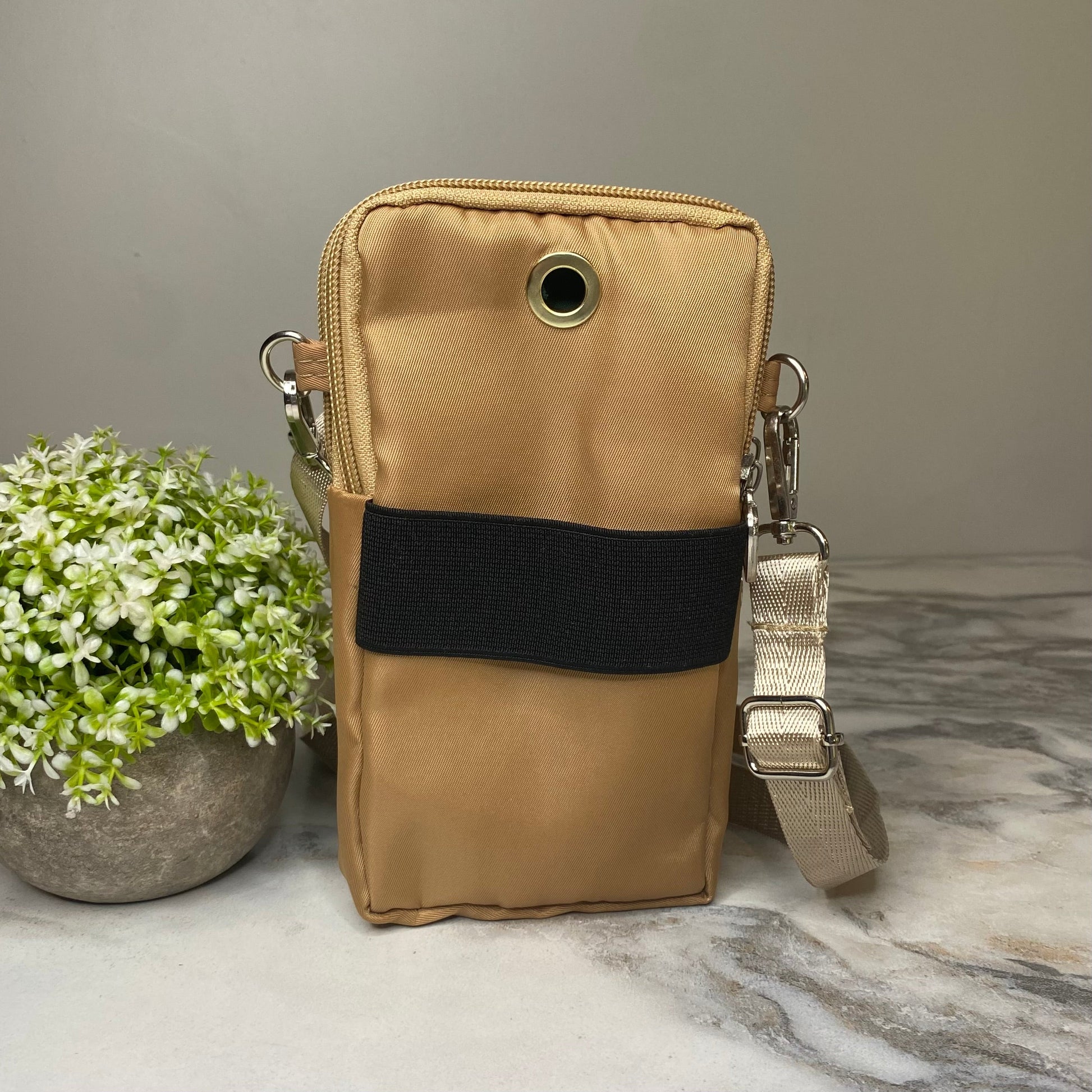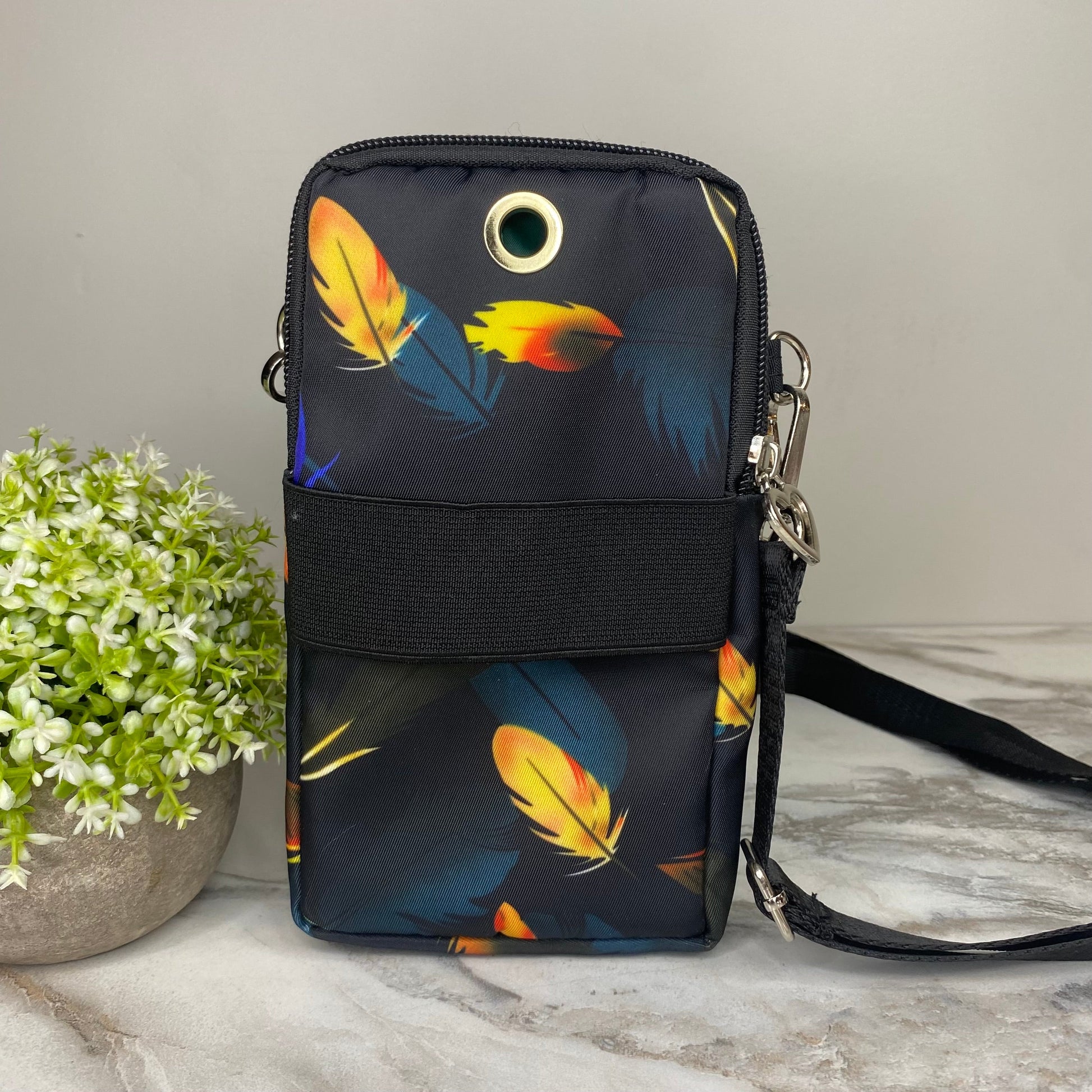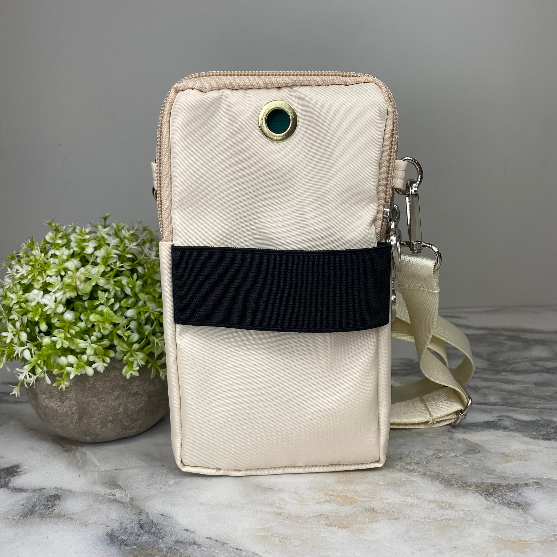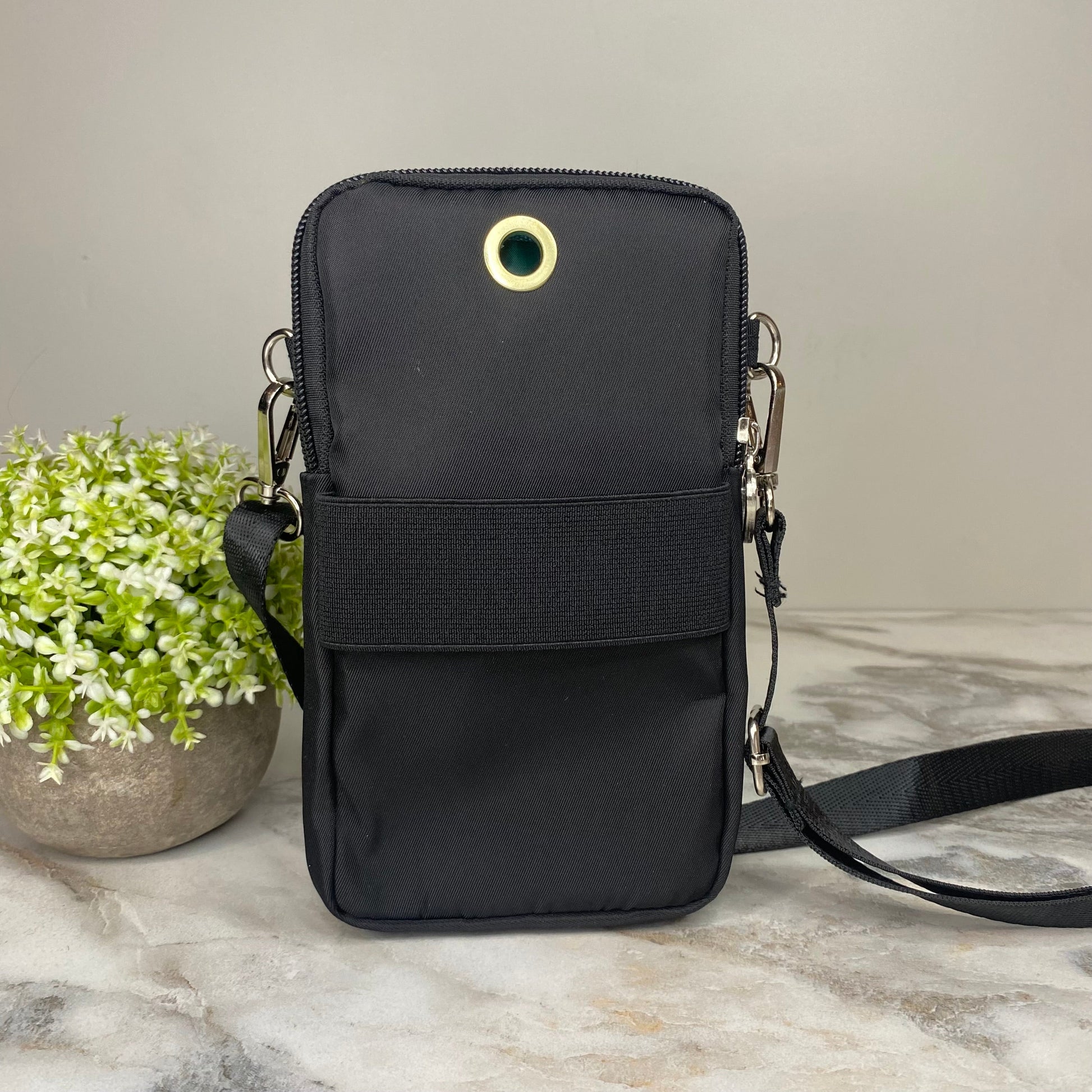 - Removable shoulder or crossbody strap + arm band