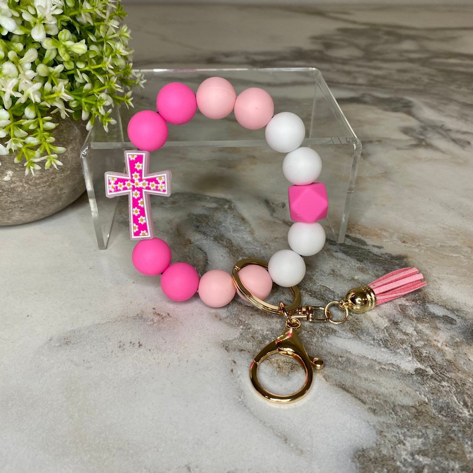 Silicone Bracelet Keychain - Cross - Hot Pink
